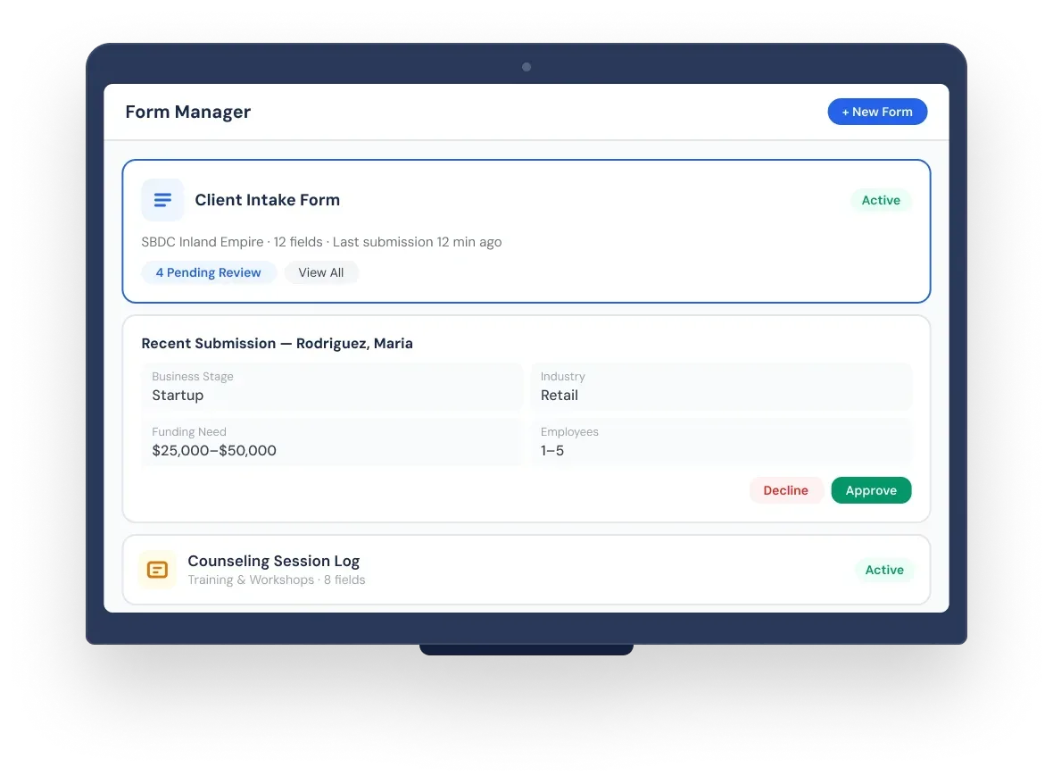 Live forms feed data directly into your ARDIS dashboard. Every submission is reviewed, approved, and automatically added to your
