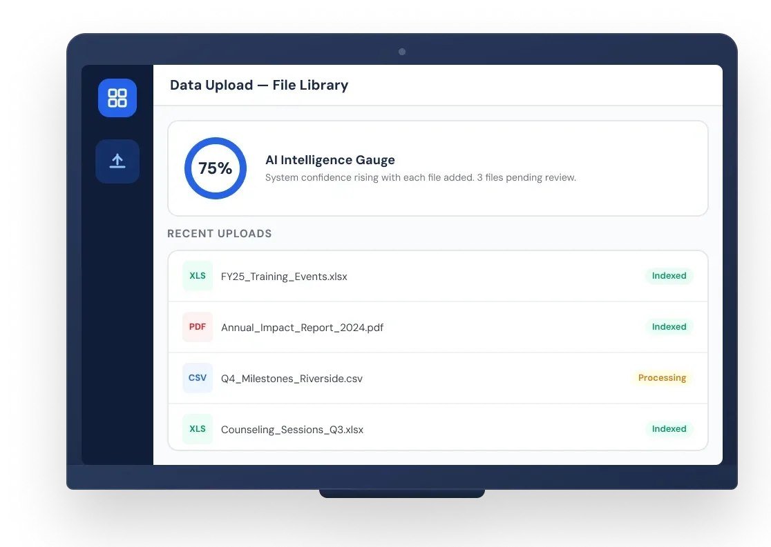 Drop in your existing files — spreadsheets, PDFs, Word documents, presentations. ARDIS analyzes the structure, confirms accuracy, and indexes everything automatically. The AI Intelligence Gauge shows system confidence growing with every upload.